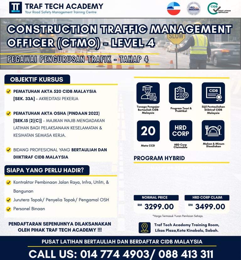 Our training modules are standardised, current, and fully aligned with the requirements of CIDB Malaysia, Arahan Teknik Jalan (ATJ), and Jabatan Kerja Raya (JKR).
